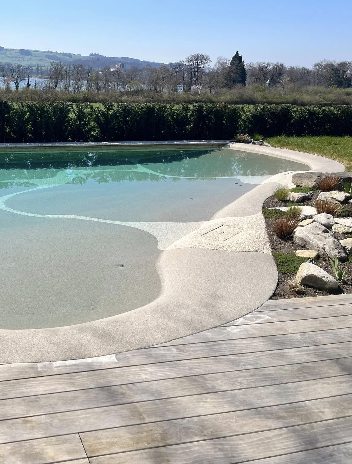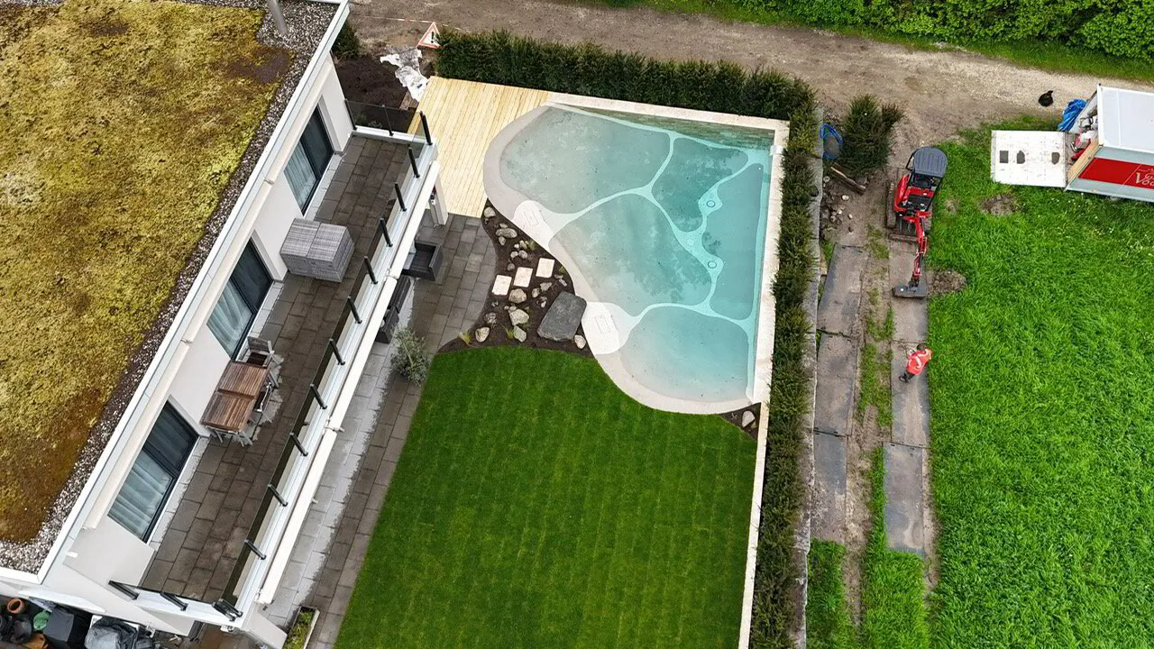 Die freigeformte Bauweise erlaubt eine flexible Anpassung an die örtlichen Gegebenheiten und sorgt für einen fliessenden Übergang zwischen Pool und Garten.