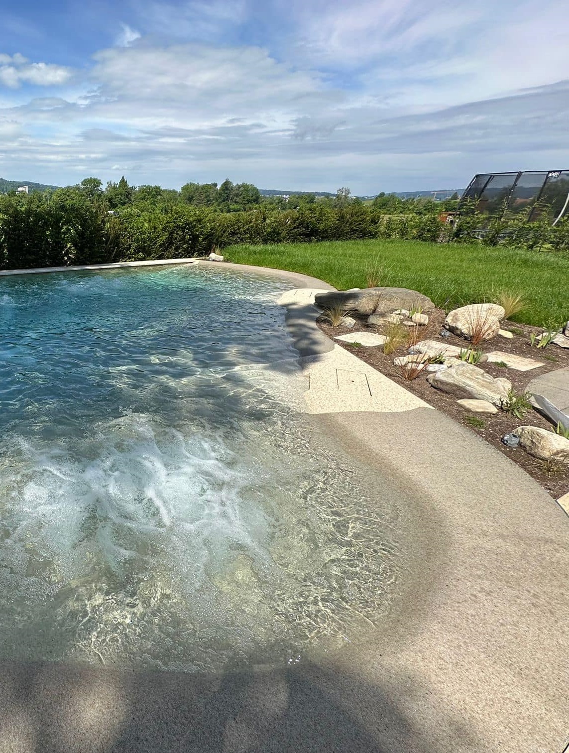 Bei diesem Projekt wurde ein Bio.Design Pool mit flacher Strandzone und integrierter Sprudelfunktion realisiert. Die organische Form und der helle Beckenbelag schaffen eine natürliche Optik, die sich gut in die Umgebung einfügt.